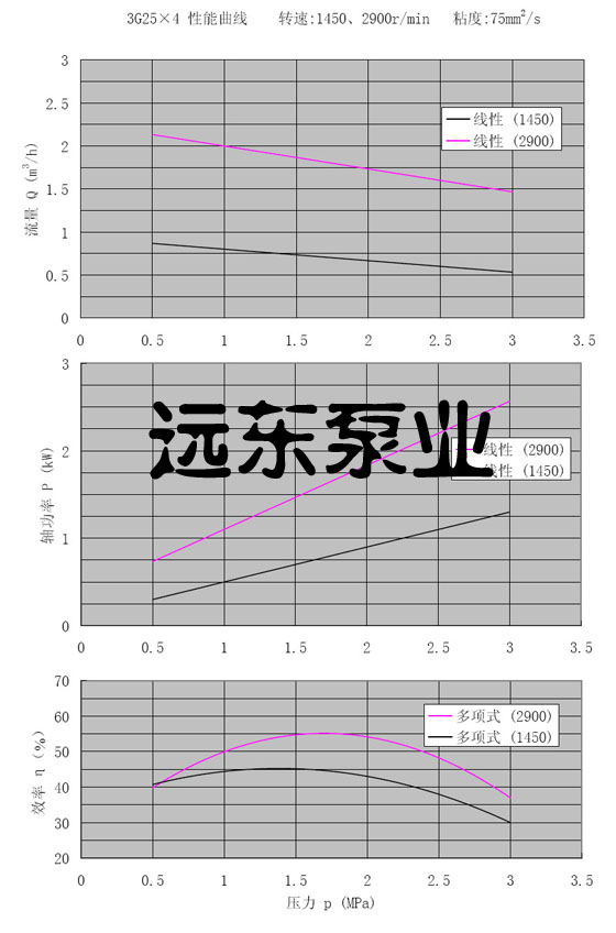 | 3GR25*4三螺杆泵轉速(su)1450,2900r/min,粘度75cst性能曲線(xiàn)圖 | ||||||