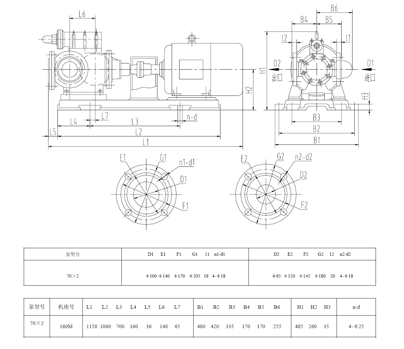 3GR70*2W2三螺杆泵配7.5KW-4電(diàn)機尺寸圖,該三螺(luó)杆泵流量24m3/h,壓力0.6Mpa,吸(xi)入🐪真空🌈高度4.5米,進(jìn)口100米,出口65米.
