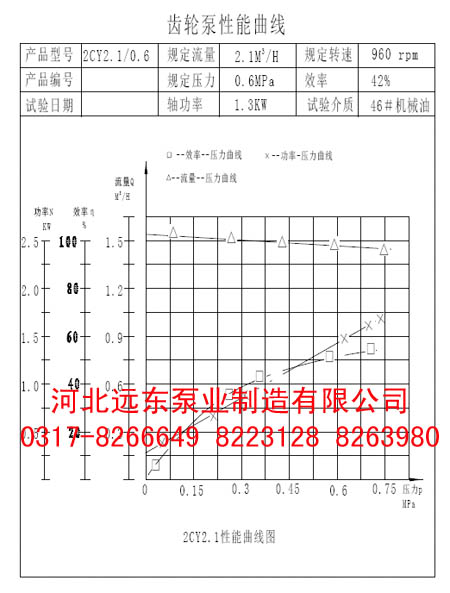 1.2CY2.1齒輪泵:流(liú)量2.1m3/h(35L/min),配用電機1.5KW時,輸(shū)出壓力:0.6Mpa;配用電機(jī)3KW時,輸出壓力2.5Mpa,該泵(beng)吸入真空高度3米(mi),口徑G1",效率58%;